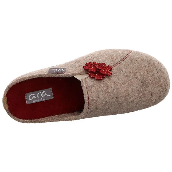 Gefertigt aus hochwertigem Wollfilz sind die Hausschuhe von ara die besten Begleiter für eine gemütliche Zeit daheim wenn es draußen ungemütlich wird. Ein innenliegende Keilsohle sorgt dabei für einen angenehmen Stand und der Wollfilz für warme Füße. Dieses Modell punktet mit einem hellen Beigeton und einer hübschen Blütenapplikation.