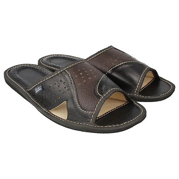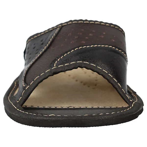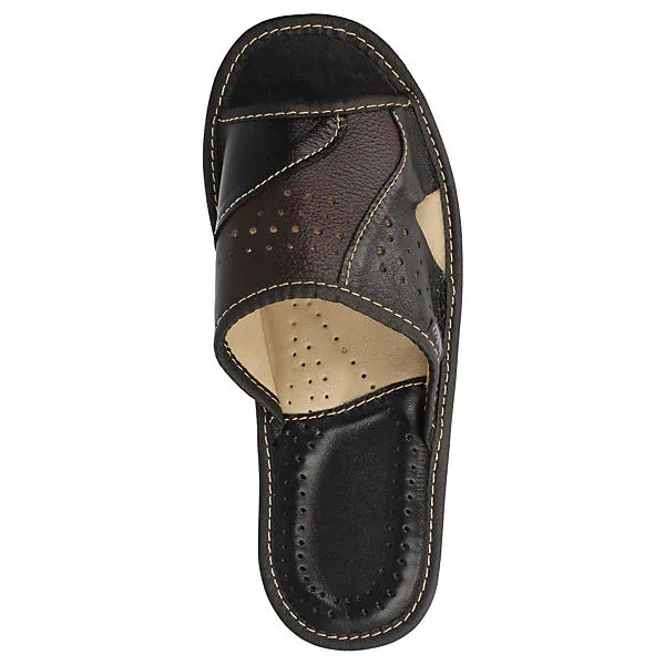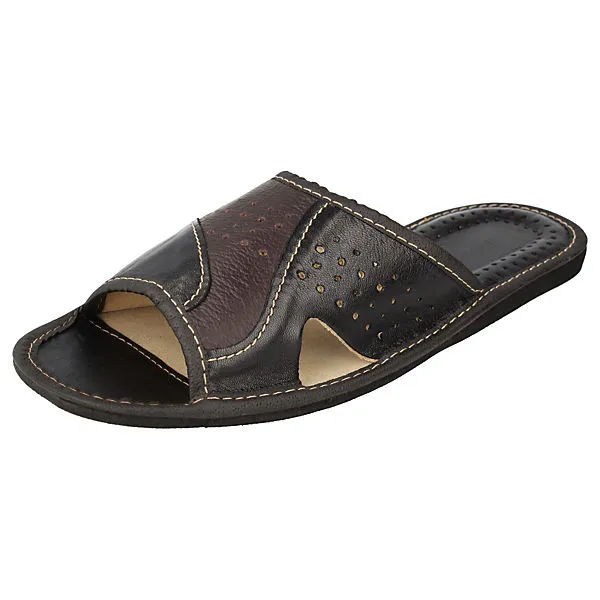 Der Herren Slipper von uns bietet ein angenehmes Tragegefühl und ein atmungsaktives Klima. Dank der Lüftungslöcher im Obermaterial und der Innensohle wird Schweißfüßen vorgebeugt. Der Fersenbereich ist gepolstert, sodass der Fuß beim Gehen und Stehen entlastet wird. Das Rindsleder auf dem Obermaterial ist von guter Qualität und lässt sich leicht mit Wasser abwischen. Die profilierte Gummisohle bietet einen sicheren Halt und schützt vor kleinen scharfen Gegenständen. Der Zehenbereich ist geöffnet, sodass der Fuß genügend Platz hat sich auszubreiten. Mit dem Herren Slipper erhalten Sie ein angenehmes Tragegefühl, ein atmungsaktives Klima und einen sicheren Halt.