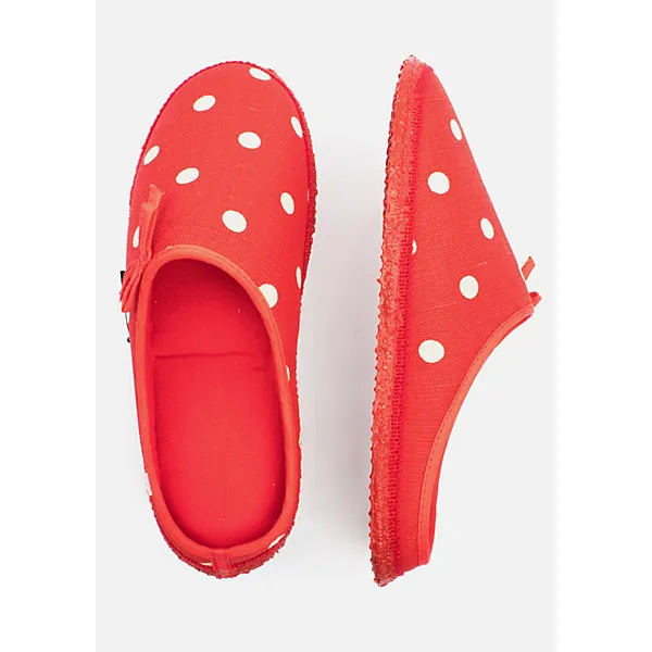 Süß und mädchenhaft ist der Pantoffel Plein mit Tupfen und Masche. Der hochwertige Baumwollstoff und die superweiche Naturlatexsohle machen ihn zum perfekten Wohlfühlschuh für daheim. Erhältlich in Natur, Rot und Dunkelblau. Obermaterial 100% Baumwolle. Die Laufsohle ist rutschfest und dennoch leicht und flexibel.