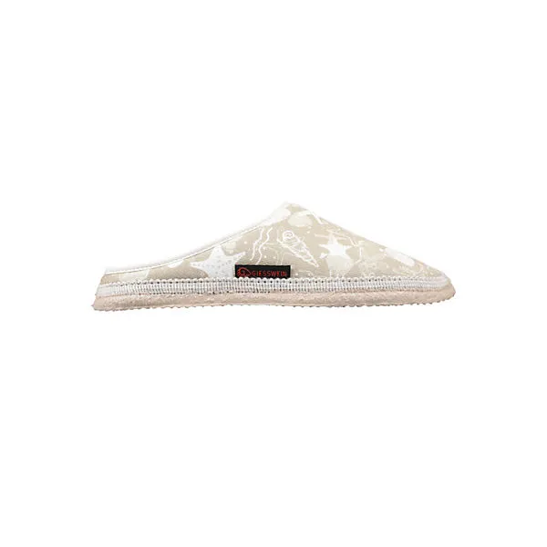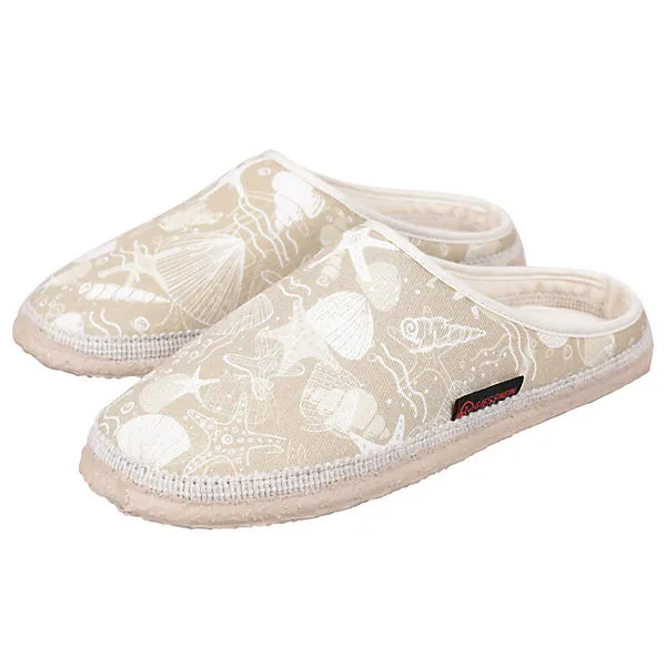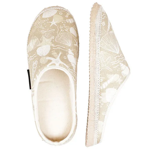 Hol dir den Traum vom Strand nach Hause. Der Baumwollhausschuh Prisdorf für Damen ist von Sandstränden inspiriert. Den sandfarbenen Schuh zieren die verschiedensten Muschel-Aufdrucke. Man spürt zwar keinen Sand zwischen den Zehen, dennoch werden die Füße auch barfuß durch den leichten Baumwollstoff verwöhnt, so, dass trotzdem ein Urlaubsfeeling aufkommt. Sowohl im Sommer als auch im Winter bringt dieser Schuh den Traum von Meer und Strand etwas näher.
