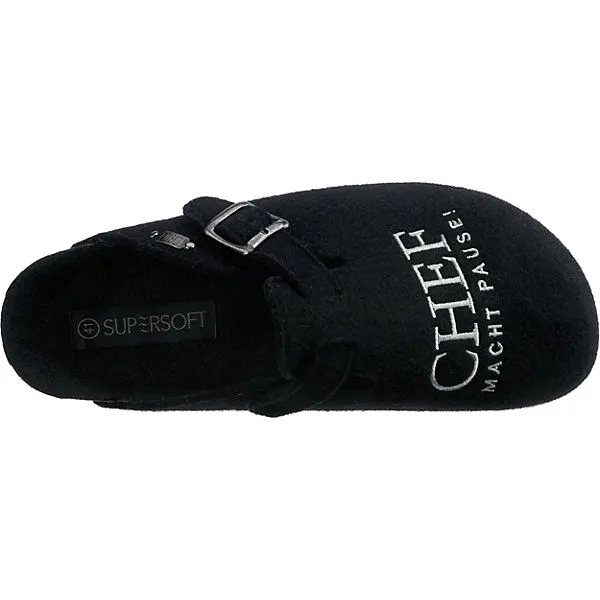 Die Pantoffeln von SUPERSOFT sind ideal für daheim. Dieses Modell ist mit einem angenehm warmen Futter versehen. In die Schuhe kann ganz schnell hineingeschlüpft werden. Die Aufmachung des Paares wird durch das textile Obermaterial ergänzt.
