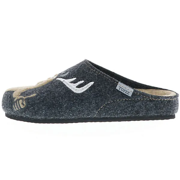 Das Obermaterial wurde aus ökologischem Wollfilz gefertigt und ist somit umweltfreundlich und angenehm zu tragen. Da das Innenmaterial und die Decksohle ebenfalls aus Filz bestehen werden die Füße angenehm warm gehalten. Optisches Highlight ist der gestickte Elch der den Daumen nach oben hält.