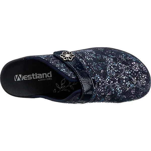 Bequem für daheim: die Pantoffeln von Westland by JOSEF SEIBEL. Der Keilabsatz kombiniert einen stilsicheren Auftritt mit hohem Komfort. Dieses Schuhpaar kommt ohne jeglichen Verschluss aus, sodass ganz bequem hineingeschlüpft werden kann. Die textile Oberfläche unterstreicht das Design dieses Modells.